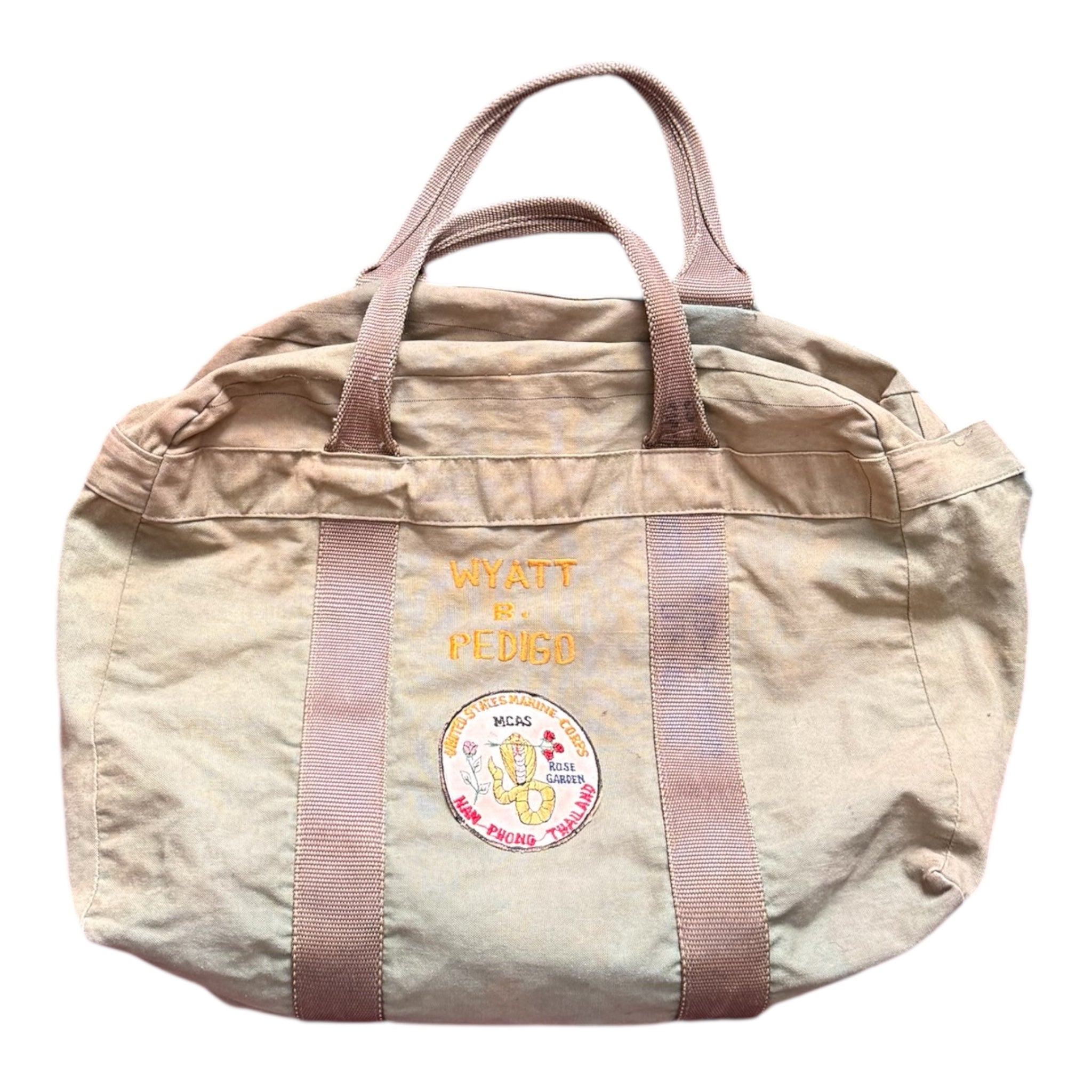 A rare and highly collectible Vietnam War–era U.S. Marine Corps flight bag, distinguished by two original theater-made patches and clear personal attribution. Pieces like this—named, patched, and tied to a specific Marine Corps aviation unit operating in Southeast Asia—are exceptionally hard to find intact.